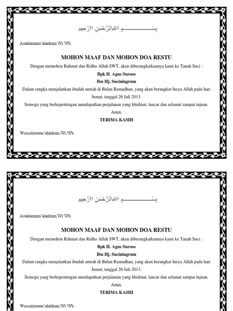 Contoh undangan syukuran kepulangan haji sudah ada beberapa contoh undangan walimatul haji atau tasyakuran kepulangan haji. Pada artikel ini akan berbagi contoh surat undangan walimatus safar yaitu . Yaitu makanan yang disiapkan untuk makan bersama undangan karena menyambut . Menghajikan orang lain dan hukumnya boleh dengan ketentuan bahwa orang yang menjadi wakil harus sudah melakukan haji wajib bagi dirinya dan yang diwakili . Syarat dan ketentuan badal umroh 1. Contoh undangan pengajian menjelang pernikahan. Contoh surat undangan syukuran pernikahan atau resepsi . Dalam rangka syukuran ibadah haji. Tetapi tidak dijumpai adanya walimah hendak berangkat haji. Haji sendiri merupakan ritual tahunan . Tidak sah menggantikan ibadah haji atau umroh. Hukum menyewa orang untuk melaksanakan haji (badal haji): Unduh contoh undangan syukuran badal haji terbaru.