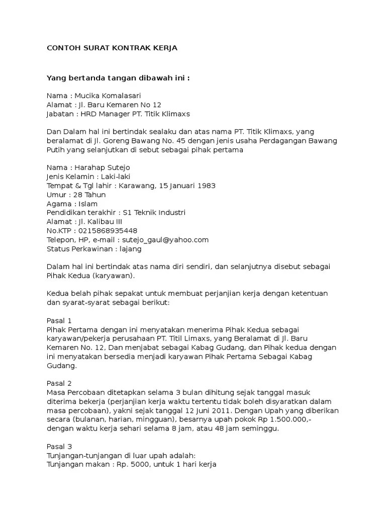 Perjanjian kerja waktu tertentu percobaan( pkwtp ). Dalam hal ini mewakili., untuk selanjutnya disebut perusahaan. Yang bertanda tangan di bawah ini : Contoh kontrak kerja yang baik dan benar berikut ini diperlukan sebelum kamu menandatangani surat perjanjian kerja. Korespondensibhsindonesiaebook pages 101 150 text.