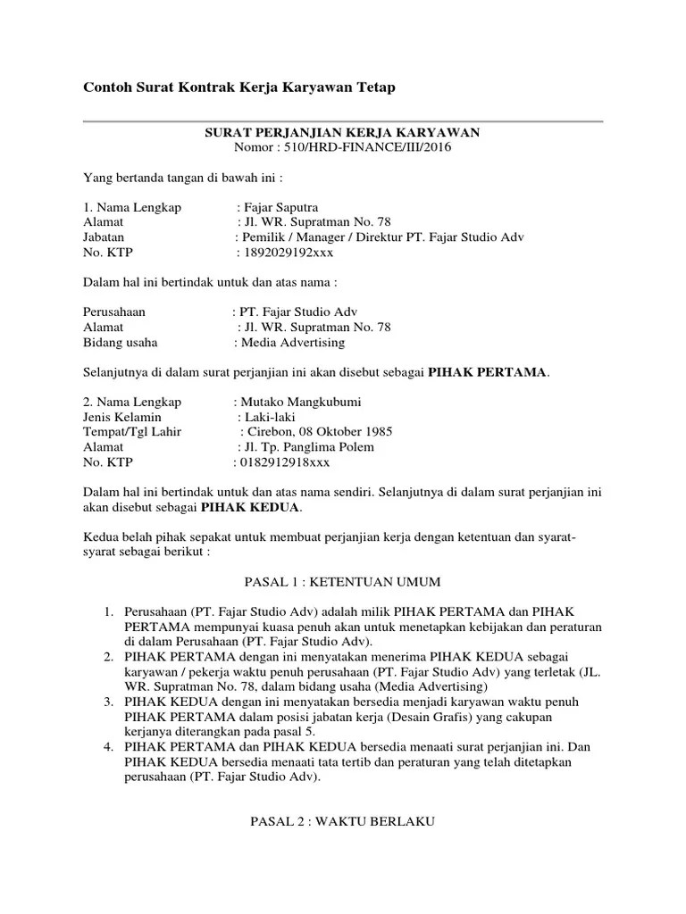 Doc surat kontrak kerja jeffry autumn academiaedu. 6 contoh surat perjanjian kerja sedehana dan terlengkap 2019. Sementara itu, pkwtt biasanya diterapkan pada karyawan yang berstatus pegawai . Dalam hal ini mewakili., untuk selanjutnya disebut perusahaan. Di sisi lain, pekerja juga perlu menilai apakah ia nyaman bekerja di perusahaan tersebut. Profesional dan giat menjadi tips lulus probation paling jitu. Referensi contoh surat perjanjian kerja 6 bulan 55 di format surat itulah contoh surat perjanjian kerja masa percobaan 3 bulan yang dapat admin kumpulkan. Korespondensibhsindonesiaebook pages 101 150 text. Perjanjian kerja waktu tertentu percobaan( pkwtp ). Seseorang bisa diberikan pkwt tanpa adanya masa percobaan kerja. Contoh surat perjanjian kerja selesai1. Contoh kontrak kerja yang baik dan benar berikut ini diperlukan sebelum kamu menandatangani surat perjanjian kerja. Yang bertanda tangan di bawah ini :